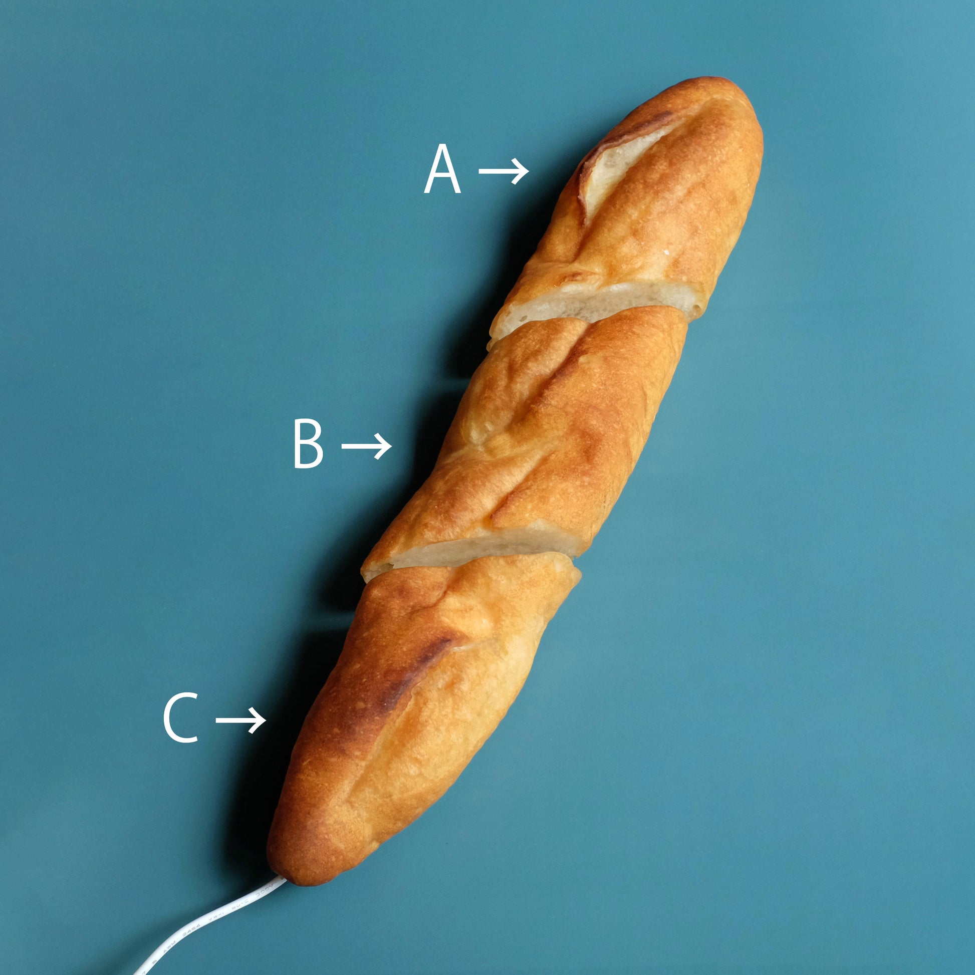 美しくカットされた1本のバタールは、端っこ二つに真ん中が一つ。どれをとってもおいしそうで、断面からのぞくやさしい灯りが魅力です。